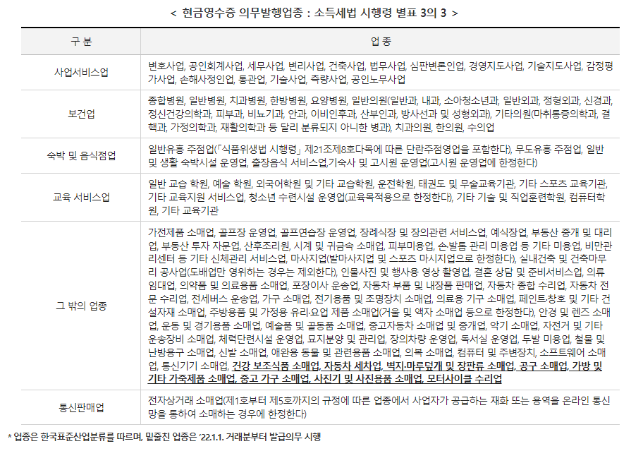 현금영수증의무발급업종은 건당 거래금액 10만 원(부가세 포함) 이상인 재화나 용역을 공급하고 그 대금을 현금으로 받은 경우 의무적으로 현금영수증을 5일 이내 발행해야 합니다. 이를 위반 시는 현금영수증 미발급가산세 20%를 부과하게 됩니다.