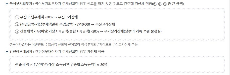 안녕하세요. 지금까지 사업자분들께서 제일 두려워하시는 가산세에 대해 시리즈로 알아보고 있습니다. 지난 포스팅에서 원천세와 부가가치세에 대한 가산세를 알아보았고, 오늘은 종합소득세와 관련한 가산세를 알아보려고 합니다. 종합소득세는 신고방법이 여러 가지이지만 마음대로 신고방법을 선택할 수 없습니다. 기장의무에 따라 신고방법을 선택해야 하는데 잘못된 방법으로 신고하여 가산세를 무는 일이 없도록 오늘은 무기장가산세와 개인사업자 분들에게 빈번하게 일어나는 몇 가지 가산세에 대해 알아보도록 하겠습니다.