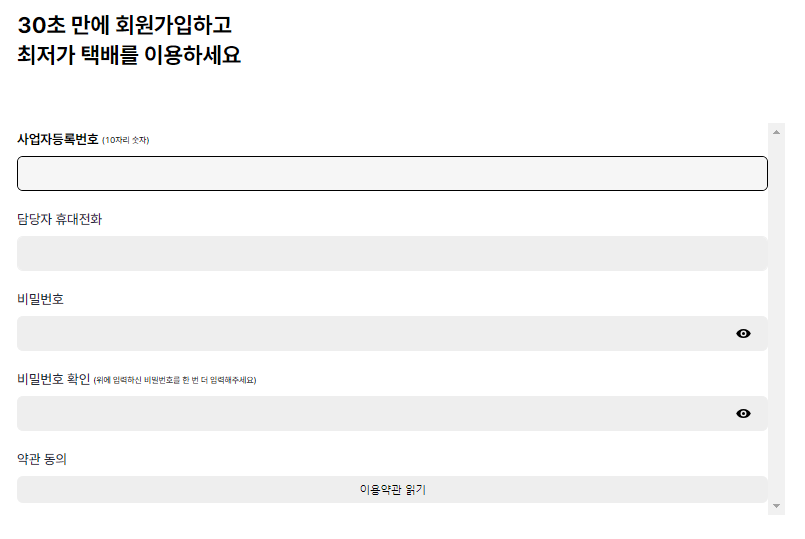 대표자명, 담당자명, 담당자 이메일 주소, 사업자 등록증, 출고지 주소 (인천만 가능), 희망 서비스 (당일+일반 / 일반만 이용 중 택 1), 주요 품목, 아이스 박스 여부, 평균 출고량, 송장 규격 안내, 회원가입 경로 선택