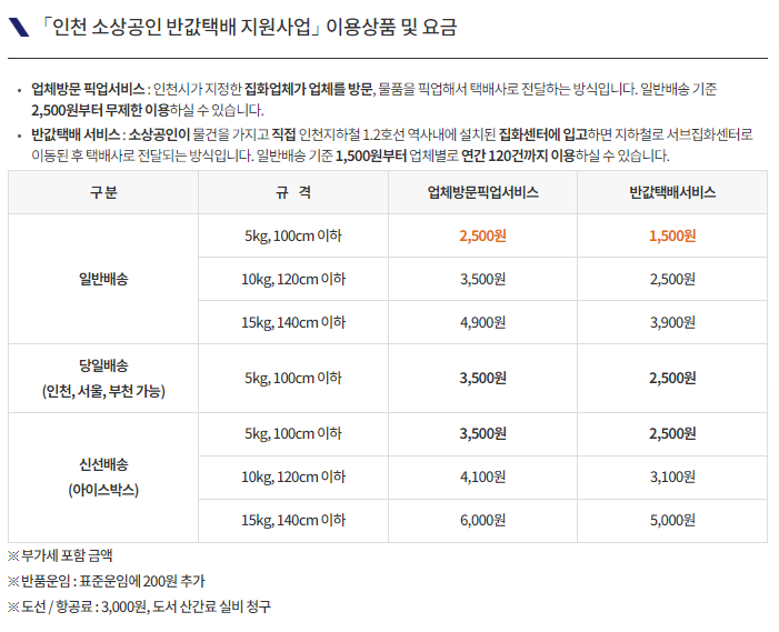 인천시는 인천 소상공인의 70%가 월평균 택배발송 물량이 10개 내외 소량이라 택배사들과 계약이 어렵고, 계약 시에 높은 단가 부담과 당일배송 불가 등의 문제점을 인지하였습니다. 이런 문제점을 해결하기 위해 물류 창고를 배송 과정에서 배제하여 배송 시간을 단축하고 개별 소상공인들이 출고하는 소규모 물량을 하나로 묶어 택배사와 일괄로 단가계약을 체결함으로써 배송시간 단축 및 택배로 절감효과를 확인하여 인천 소상공인 대상으로 반값택배 지원사업을 추진하게 되었습니다. 반값택배 지원사업은 2024년 10월 24일 시행예정입니다.