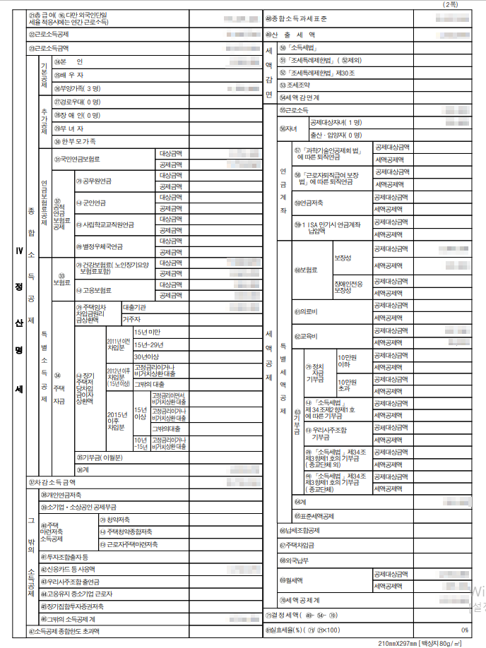 위 사진은 우리가 연말정산을 하고 받게되는 근로소득원천징수영수증의 2번째장 내용입니다. 이 서식이 연말정산의 전체적인 흐름을 보여주고 있는데요.